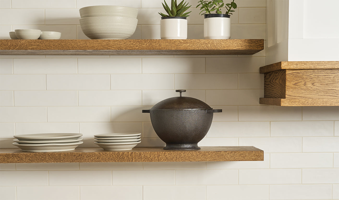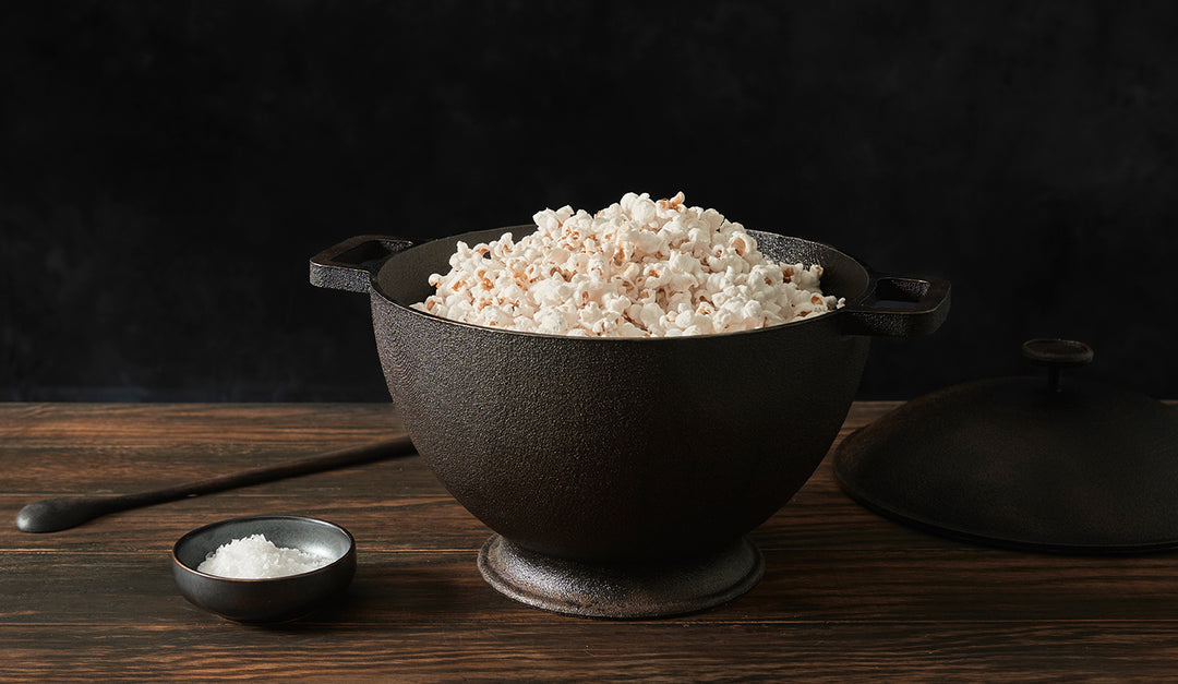 Patented for making popcorn with applications in a range of culinary uses, the Signature Kettle is more than utility. Its curvilinear cast iron form is an honest expression of the rounded interior common to traditional rustic cooking pots used outdoors over open flame as well as pre-industrial hearth kitchen cookery. Adapted for the modern kitchen, a wide footing provides stability on the flat plane of the stovetop. In this translation of practices over time, we look to our collective cultural history as we continue to develop new, innovative products and recipes in an ever more globalized world.